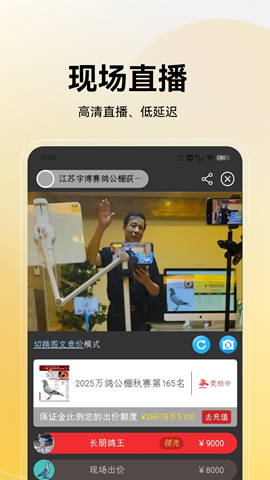 4K超清画质呈现赛鸽细节,支持弹幕互动与专家解说,提升竞拍体验。