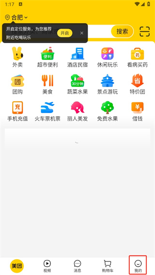 1、首先打开美团外卖软件,进入到首页中后可以切换到视频、消息、购物车、我的页面,我们点击右下角的【我的】;