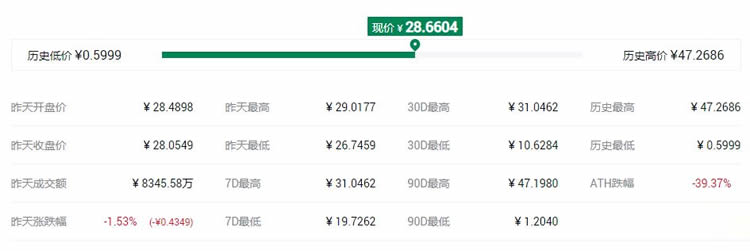 币安币简称BNB,市值25.83亿美元,占全球总市值的0.92%,流通量是1.52亿枚,24小时成交额1.71亿美元,24小时成交量1014.8万,历史最高价39.5665美元。