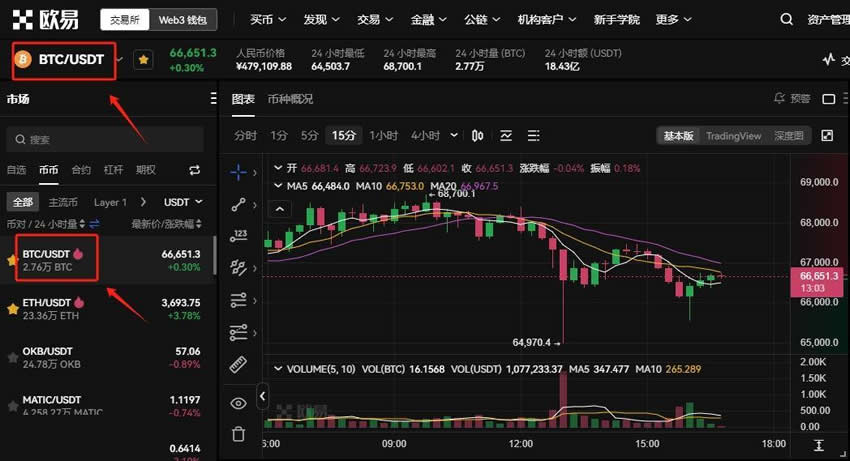 7、在币币交易页面,点击左侧的BTC/USDT交易所,也可在搜索栏输入需要交易的币种
