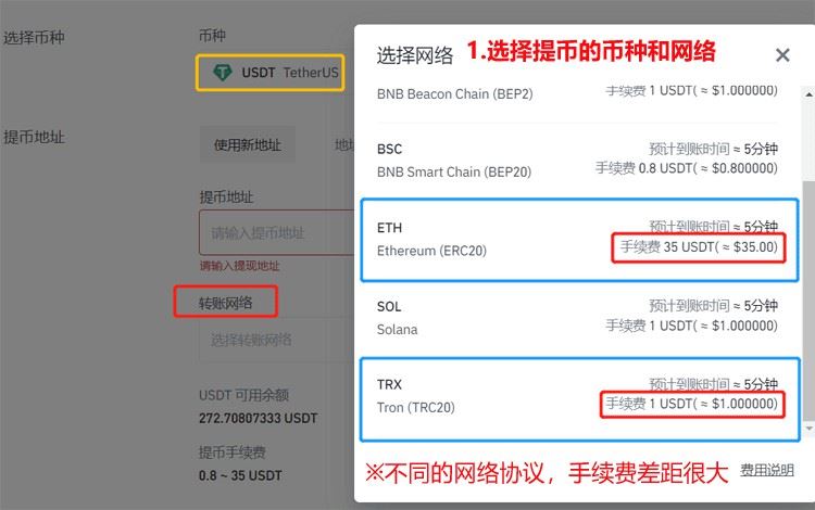 要从币安提币,首先在币安交易所选择提币的币种(USDT)和网络协议(TRC20)。使用TRC20网络,单笔转账手续费只需要$1,ERC20则高达$35!