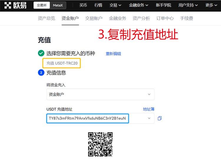 在充币的OKX交易所,选择充币的币种(USDT)和网络协议(TRC20)。特别需要确认的是,提币和充币的交易所使用的网络协议要一致,都是TRC20。