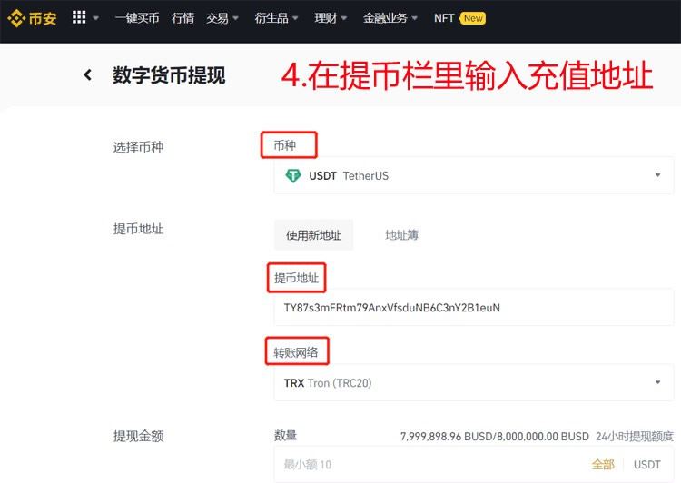 在币安交易所的提现地址栏里,输入复制的OKX充值地址。意思是告诉币安,按照这个地址汇款就可以了。