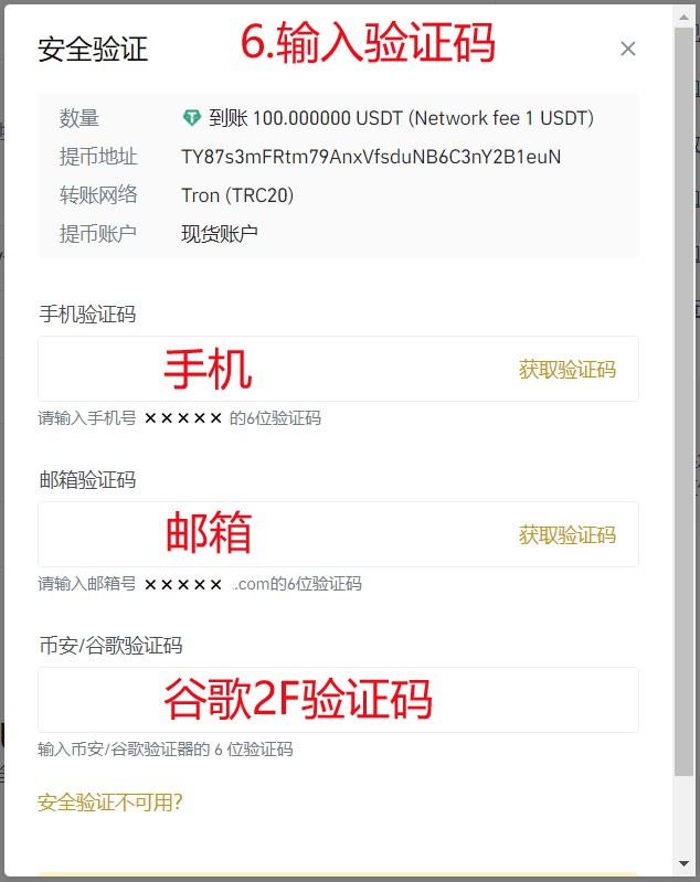 在这里需要输入三个验证码,依次点击,获取手机、邮箱和Goole的2FA双重验证码。