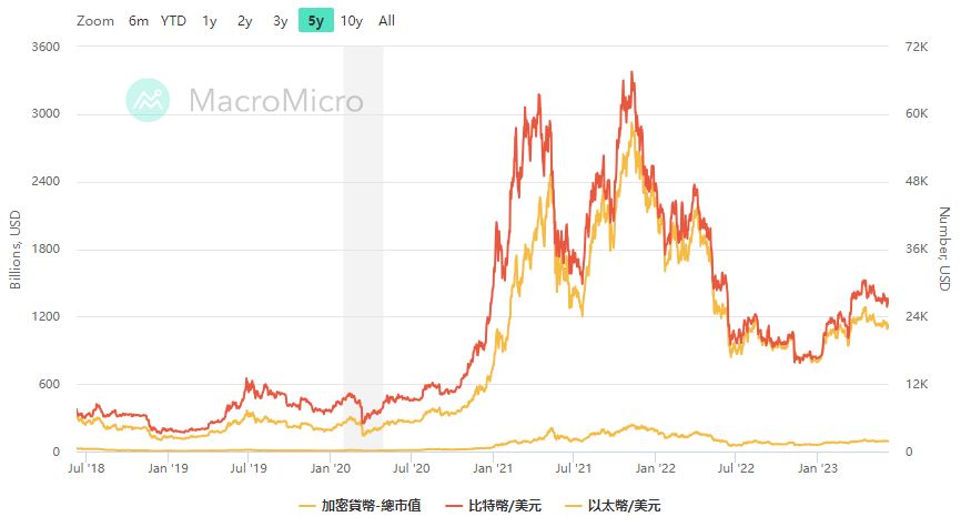 【加密货币总市值变化趋势、比特币价格走势、以太币价格走势;图源:MacroMicro】