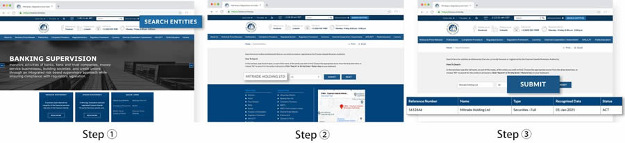 以Mitrade为例,平台目前同时持有CIMA授权的SIB牌照,号码为1612446;ASIC授权的牌照AFSL 398528;FSC授权监管,许可证号码为GB20025791。我们先来查询一下CIMA授权的牌照有效性: