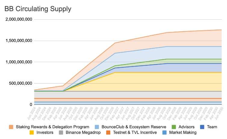 BB 币的总供应量上限为2,100,000,000 $BB,这个数字是对比特币总供应量2,100 万的认可。 $BB 总供应量的一部分将在主网启动时变成流动性,剩余的代币将作为未来的权益奖励进行分配,或在未来几年内归属。