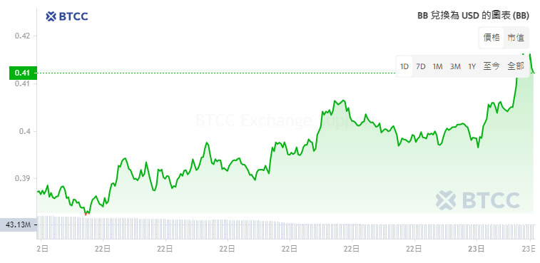 截止6 月21 日,BB 的交易价格为$0.4082,在过去24 小时上涨了2.43%,最高达到$$0.4181。