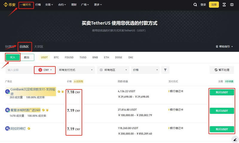 6、在进行现货交易前需要获得USDT,可在“一键买币”——“自选区”——“买入”获得,注意法币需要选择CNY,然后根据需求选择交易商家