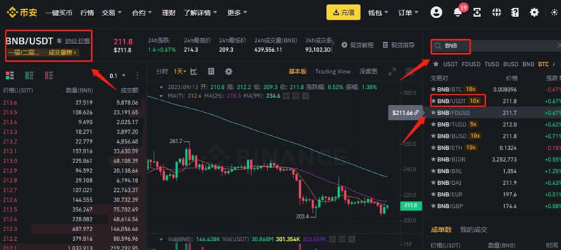 8、搜索币种简称【BNB】,选择【BNB/USDT】交易对