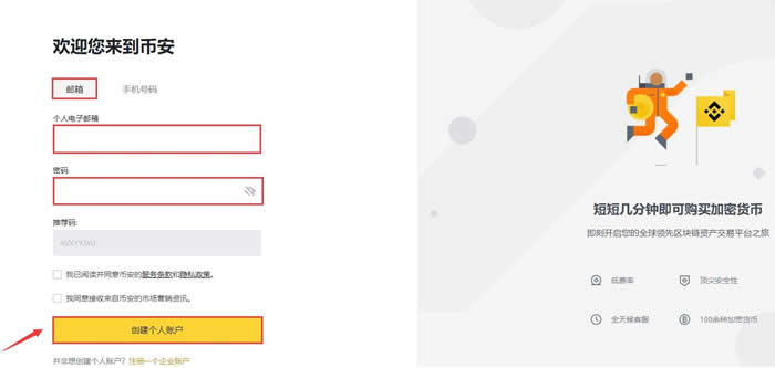 1、打开币安官网,点击左侧的【使用手机号邮箱注册】