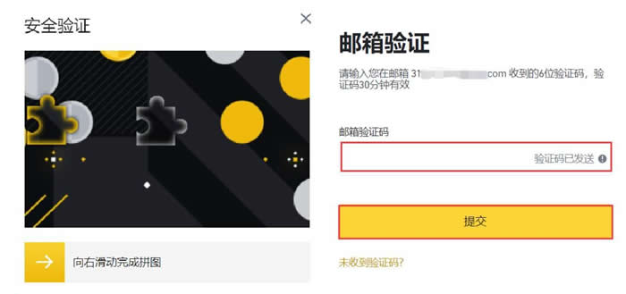 3、在安全验证弹窗中向右滑动完成拼图,及时登录邮箱输入验证码,点击提交