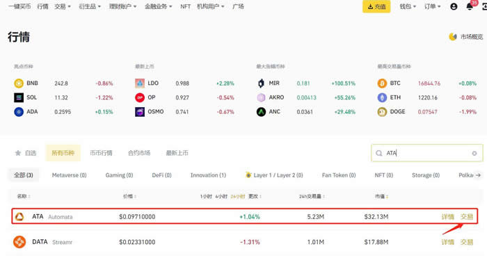 3、点击ATA右侧的交易按钮,即可进入购买页面