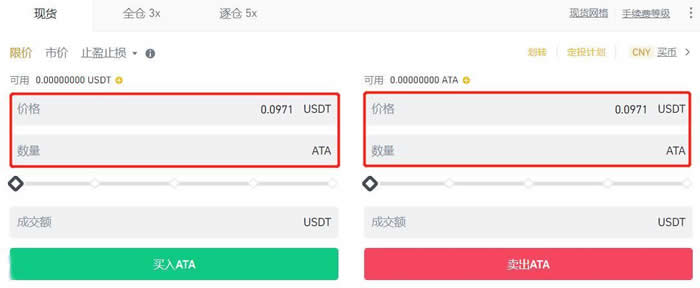 4、注意选择交易对为ATA/USDT交易对,填写好购买数量,点击买入即可。
