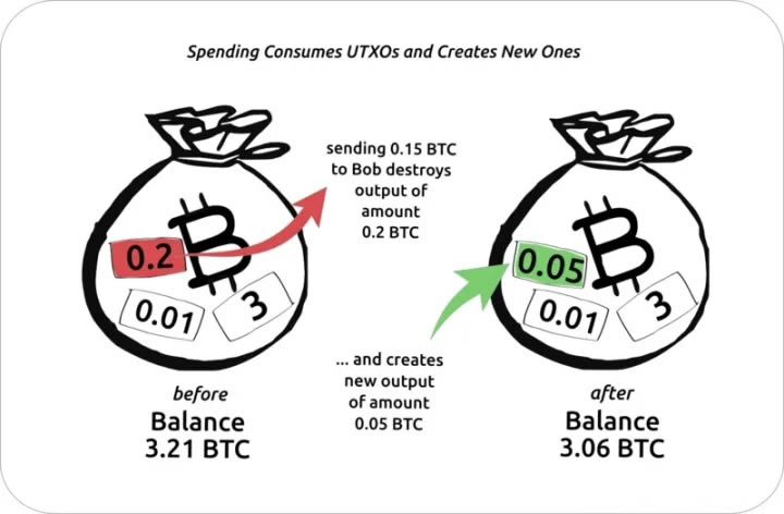 各种收到的金额不会像在实体钱包中那样混合。相反,在我们花费比特币时,收到的金额(UTXO)被单独使用(或组合使用)。在创建支出交易时,我们的钱包选择UTXO(具有足够的价值以满足我们想要发送的金额)并且通常创建两个新输出:一个用于接收器,一个用于我们收到的更改到钱包。更改成为我们钱包中的全新UTXO,我们发送的金额成为锁定到收件人地址的UTXO——可能与钱包相关联,也可能不与钱包相关联,例如冷存储。用作支出交易的输入的原始UTXO将“花费”并永久销毁。