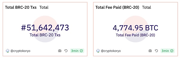 而根据 dune 上关于 Brc20 的数据统计,截止 2024 年 1 月 27 日,Brc20 铭文一共为比特币矿工带来的手续费约为 4775 枚比特币。
