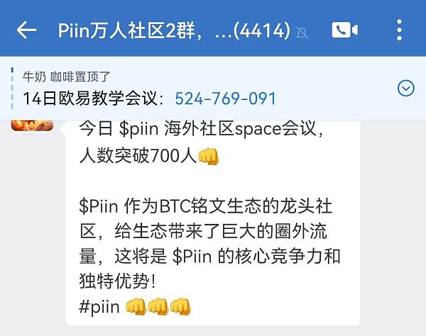Piin社区内每周都会组织几次中文或英文形式的在线会议(如推特space),每场会议平均保持1-2千人参会,最高有超过10万人次收听会议,而这是其它铭文难以见到的盛况,而在会议中有很多Piin的志愿者自发地对不了解Piin的人群宣传Piin的故事以及指导如何购买Piin。