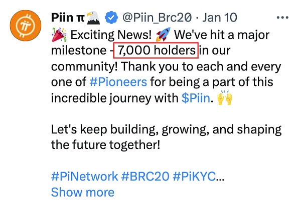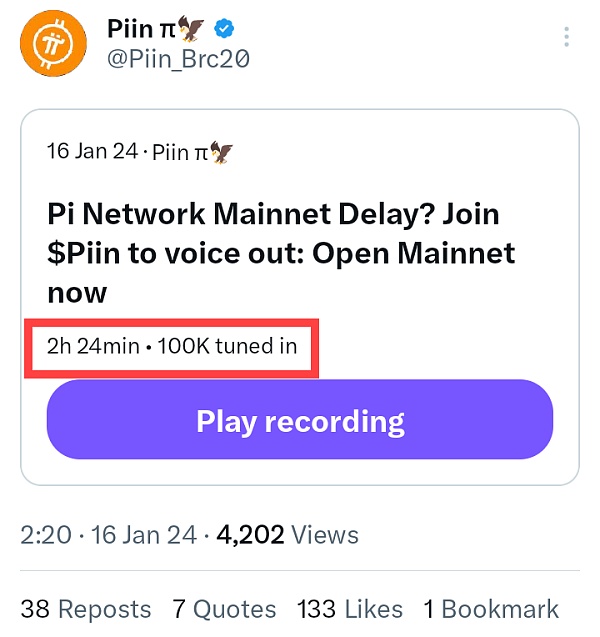 另一方面,Piin 也可以作为鞭挞 Pi Network,加快建设其主网的一个重要社区推动力象征,因此拥有上百万关注量的 Pi社区推特也在积极推广 Piin,为 Piin 进行背书。