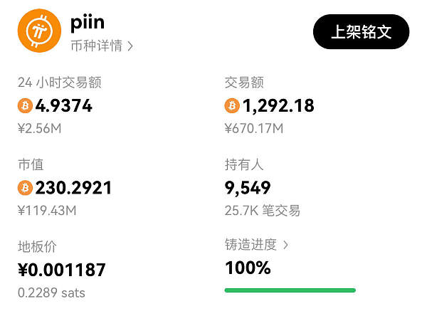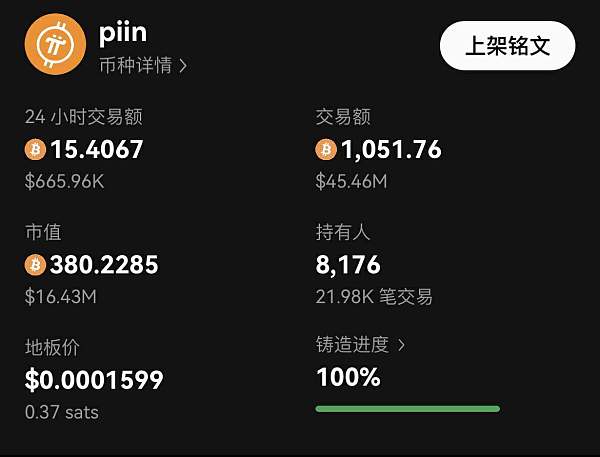 从代币经济学角度看,Piin 是由 Pi Network 社区的矿工们自行发起的,总量 1000 亿枚的,代币在市场上全流通的,不可更改代币经济模型的铭文项目。